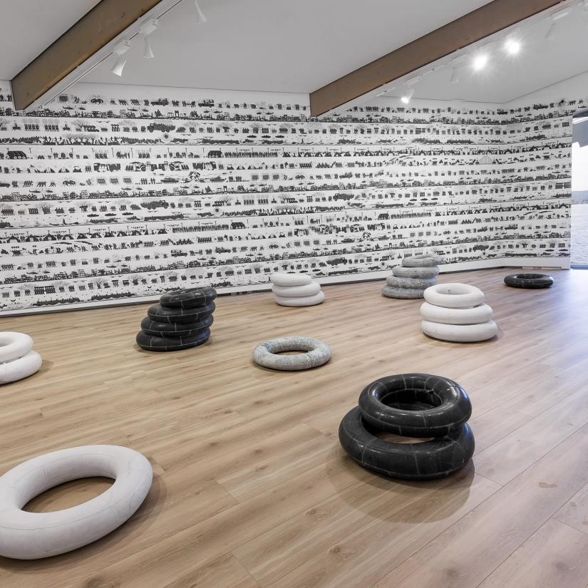 Verket Tyres (2016) og Odyssey (2017) av Ai Weiwei, vist på Astrup Fearnley Museet i Oslo. Foto gjengitt med tillatelse fra Astrup Fearnley Museet.