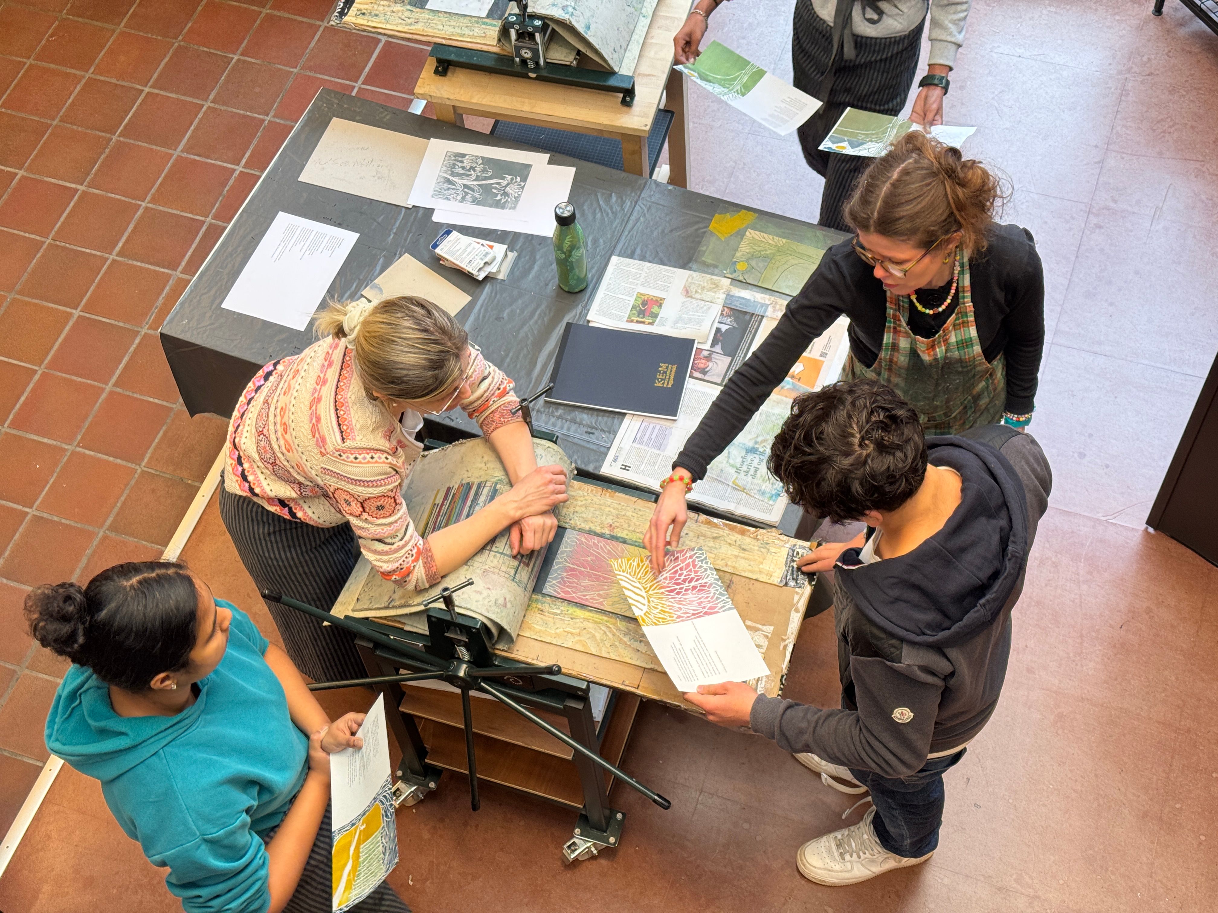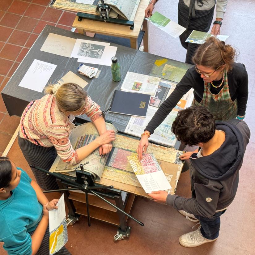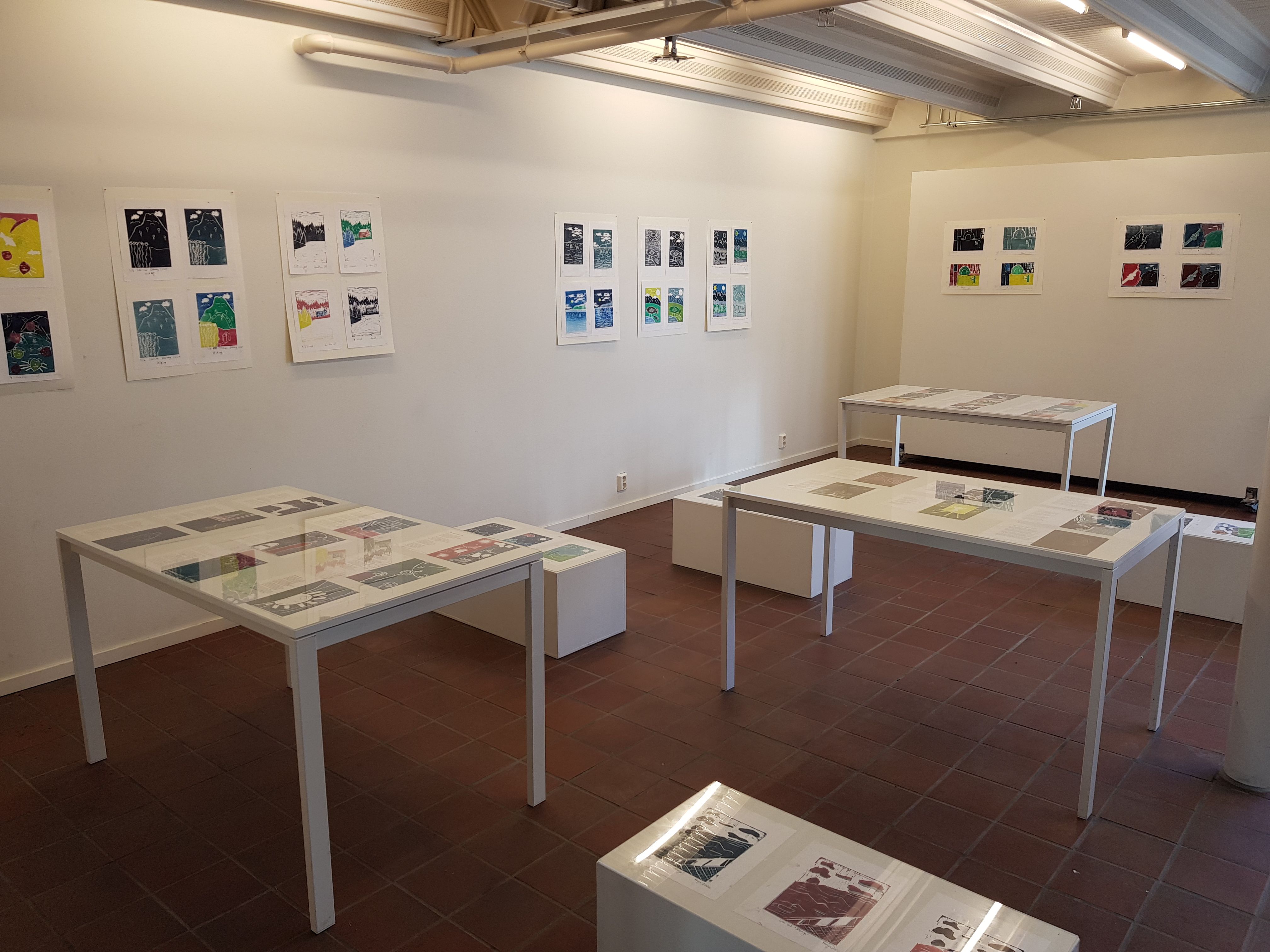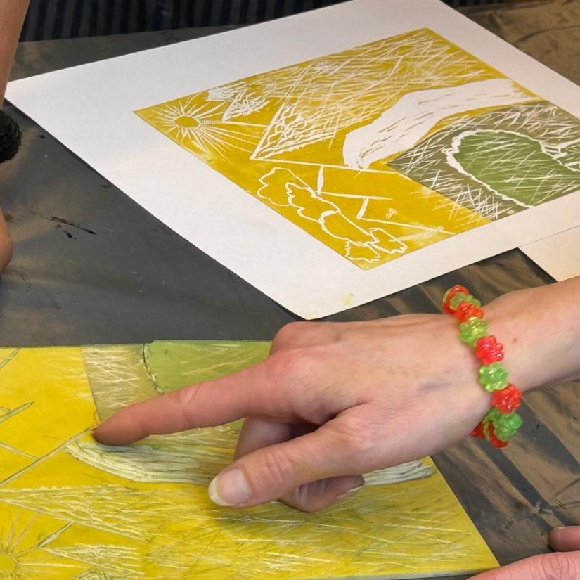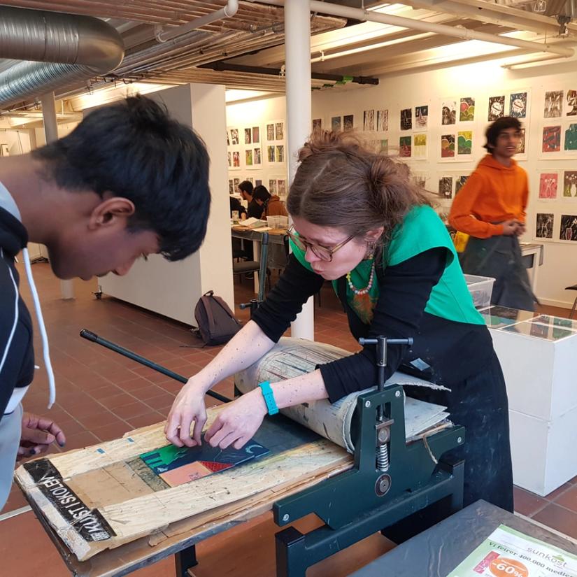 Marianne Karlsen veiledet dem i flere ulike teknikker innenfor høytrykk, blant annet puslespillteknikk, reduksjon og flerfargetrykk.