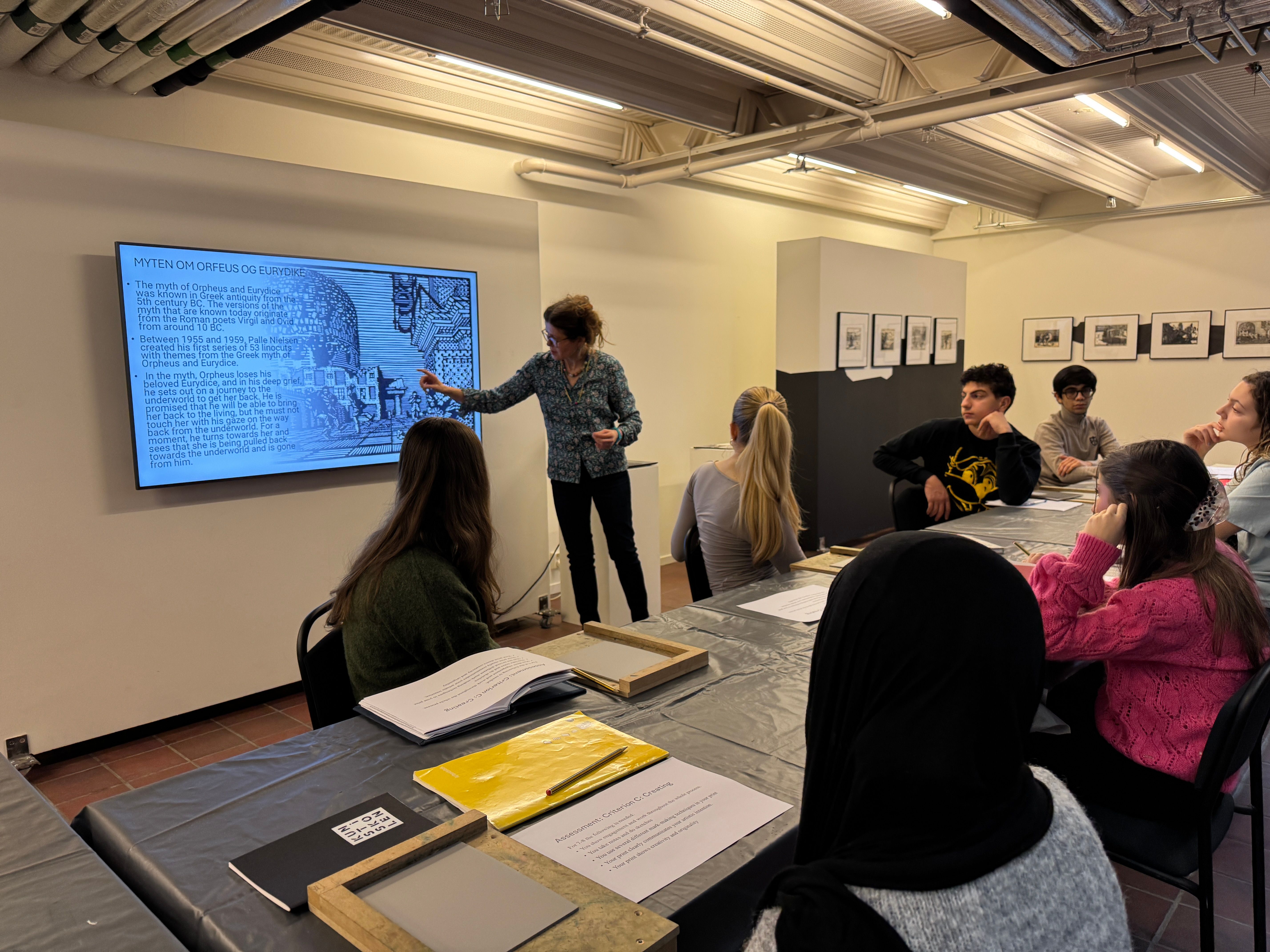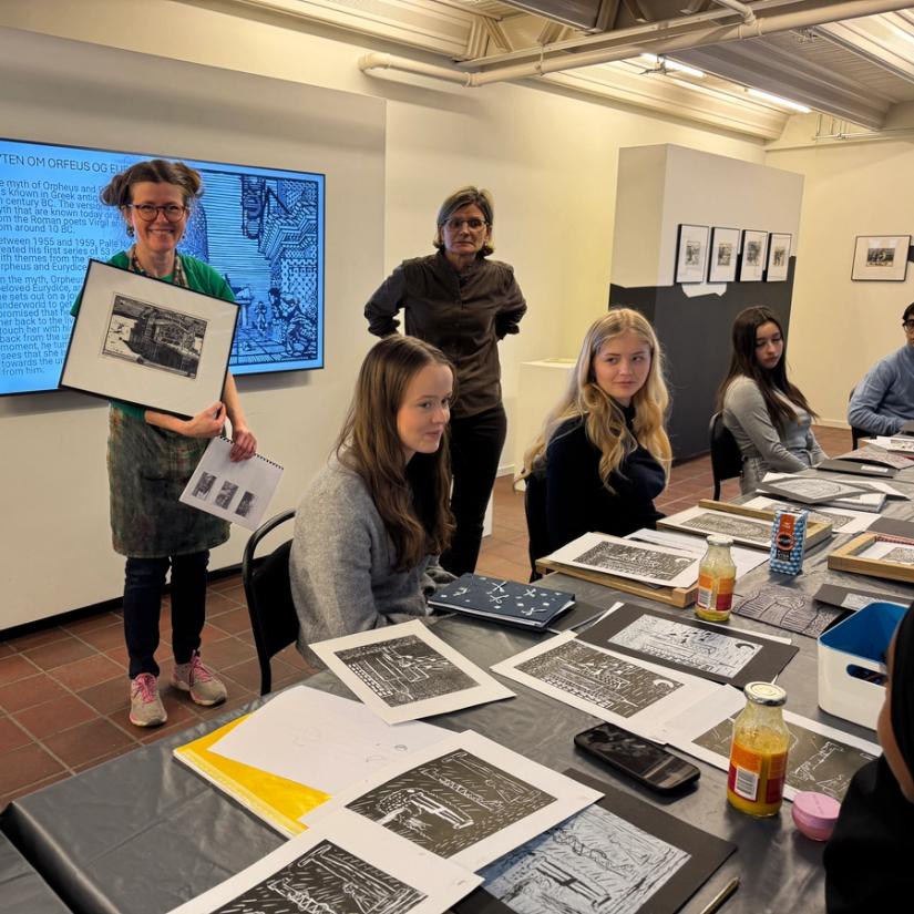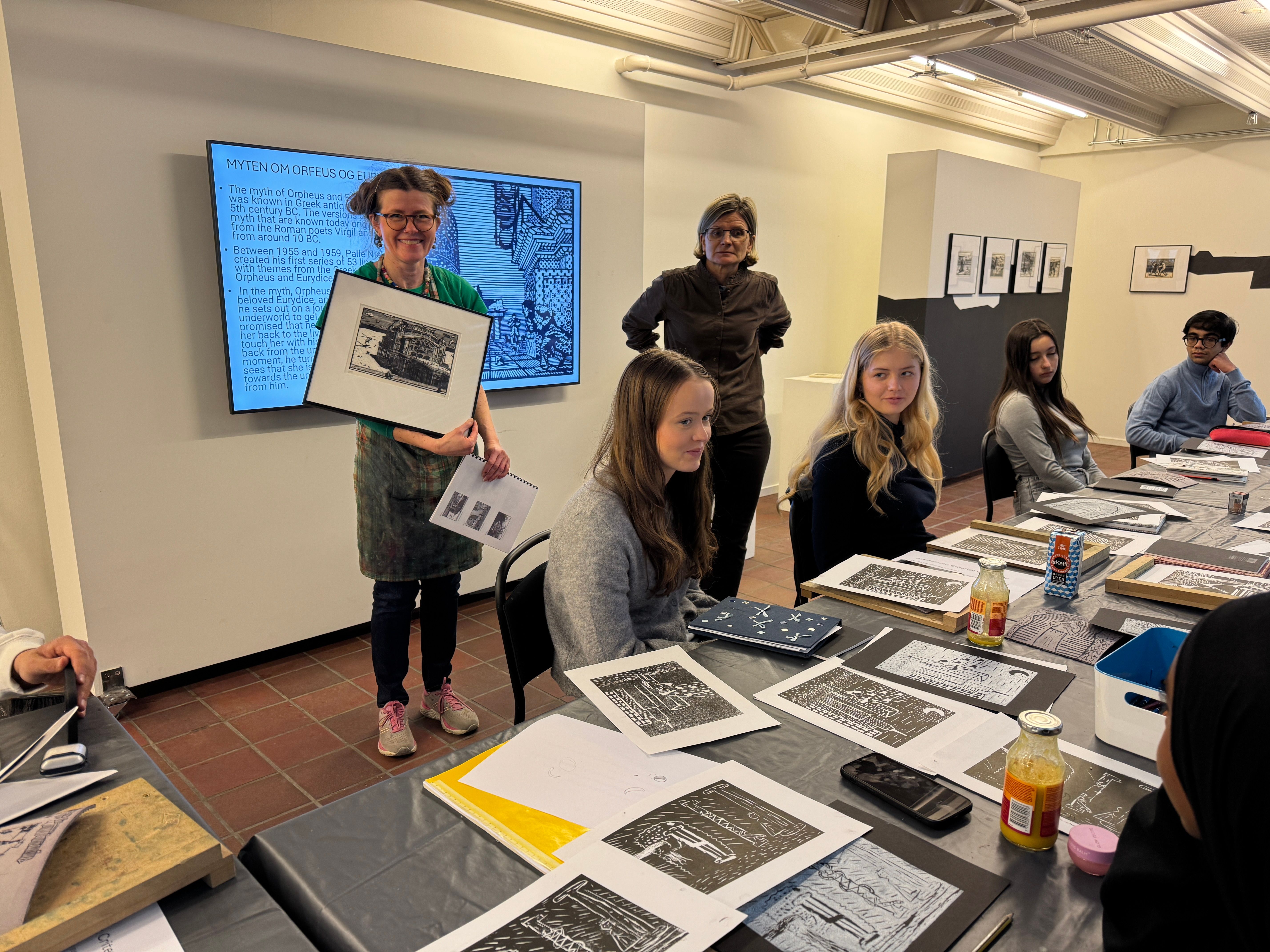 Klasse 10IC jobbet med inspirasjon fra den danske grafikeren Palle Nielsen (1920-2000). Palle Nielsen lagde mellom 1955 og 1959 sin første serie på 53 linosnitt med tema fra den greske myten om Orfeus og Eurydike.
