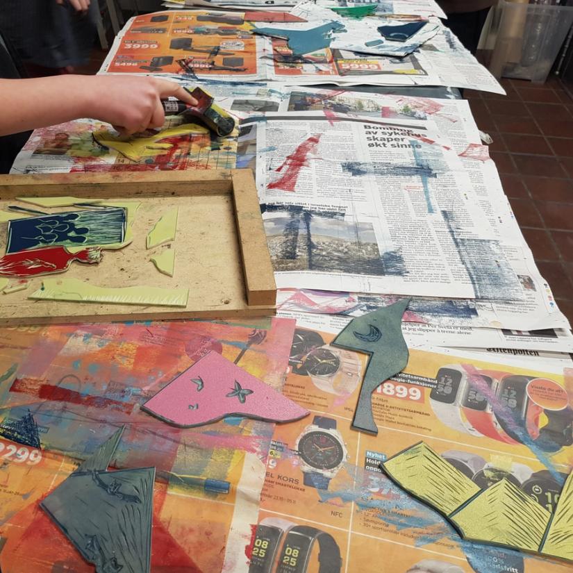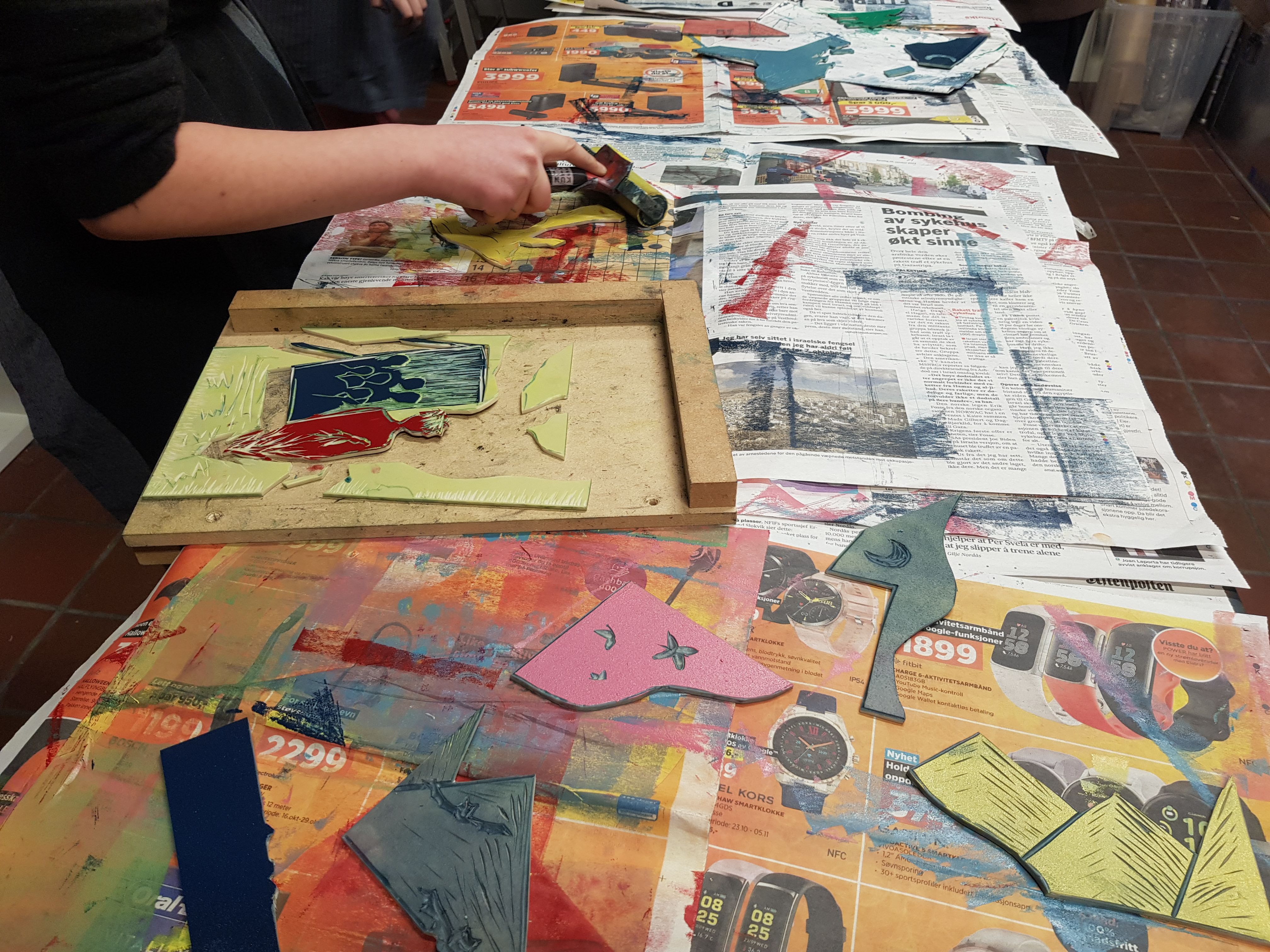 Elevene i klasse 10IC jobbet med linotrykk inspirert av d Palle Nielsen.